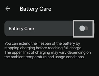 - When Battery Care is enabled, charging may not start depending on the remaining battery charge or may stop before the battery reaches 100%. The exact charge level at which charging stops can vary depending on ambient temperature and usage conditions.