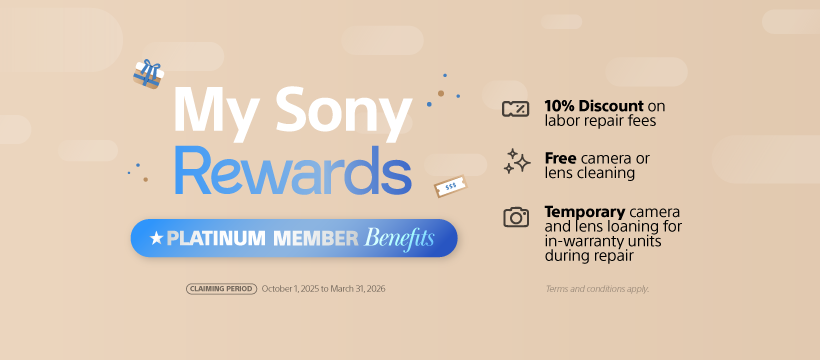 • Free Camera or Lens Cleaning: To receive the free cleaning service, your unit must be registered on My Sony. As a Platinum member, you are eligible for one free cleaning of one camera or one lens.