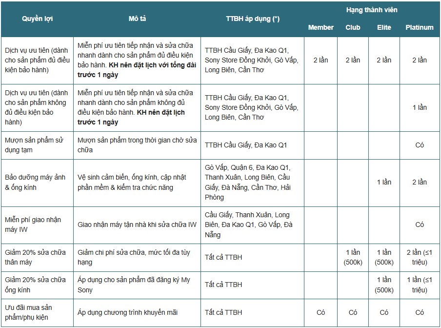 Tùy theo hạng thành viên MySony, khách hàng sẽ được hưởng các quyền lợi sau: